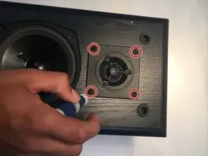 После снятия сетки начните откручивать винты, крепящие маленький верхний динамик/твитер, с помощью отвертки Phillips №1.