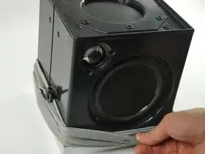 После того как все винты будут удалены, аккуратно вытяните черную панель, чтобы убрать её с верхней части динамика.