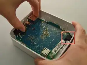 Чтобы удалить материнскую плату, возьмитесь за USB-порт и Ethernet-порт. Поднимите вверх, затем сдвиньте к передней части устройства, чтобы освободить материнскую плату от черного удерживающего зажима, показанного справа.