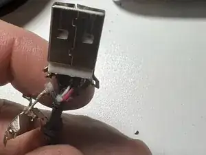 Затем я припаял каждый провод к соответствующей клемме (по моему предположению, и вот тут сюжетный поворот!), ориентируясь на изображения USB-разъёмов из Google, которые указывали последовательность проводов как «Масса/Data+/Data-/VCC (+5В)». Во всех схемах, которые выдал Google, эта последовательность была представлена как чёрный/зелёный/серый/красный.