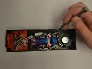 Найдите два винта с крестообразной головкой (длина 5/16", головка 1/8"), удерживающие батарею, и отвинтите их с помощью отвертки #1.