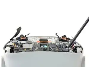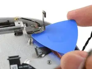 Просуньте кончик медиатора под гибкий кабель батареи, чтобы ослабить клей, удерживающий его к гарнитуре.