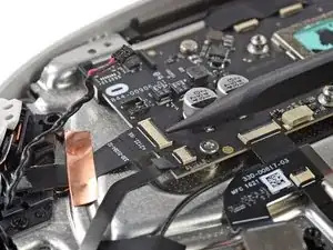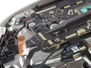 Используйте лопаточку, чтобы приподнять чёрную фиксирующую защёлку, удерживающую гибкий кабель левого микрофона на левом соединительном кабеле.