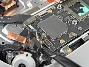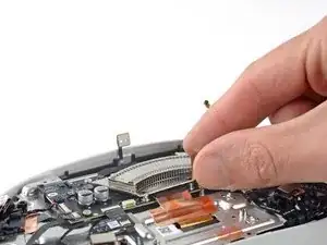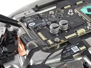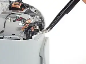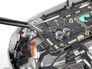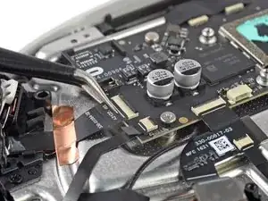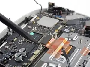 Используйте пинцет, чтобы захватить кабели левого динамика у основания их разъёма на плате.