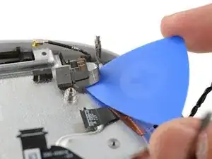 Используйте лопатку, чтобы отжать наружный кронштейн динамика от уплотнителей, которыми он прикреплён к узлу динамика.