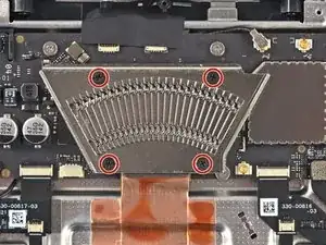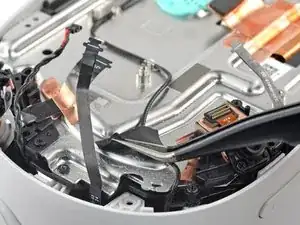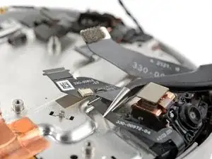 Используйте чистый ноготь или лопаточку, чтобы отжать фиксирующую защёлку, удерживающую кабель верхней левой камеры.