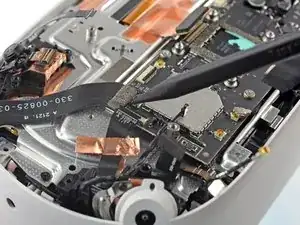Используйте пинцет, чтобы аккуратно оторвать чёрную ленту, покрывающую два верхних гибких кабеля.