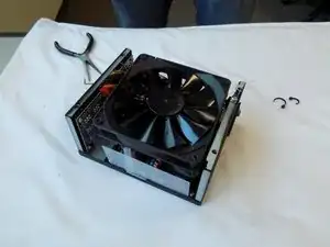 Обратите внимание на относительное положение вентилятора. Для правильного выравнивания вентилятора при сборке может быть полезно снять решетку вентилятора и использовать руки, чтобы выровнять вентилятор с помощью четырех отверстий. Используйте два винта, снятых на предыдущем шаге, в противоположных углах, чтобы обеспечить правильное выравнивание вентилятора.