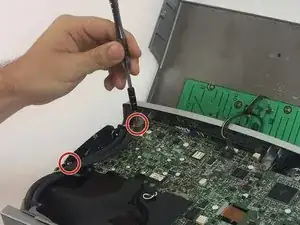 Открутите два шурупа Phillips #0 длиной 7 мм, крепящих вентилятор к материнской плате проектора.