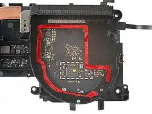Используйте отвёртку Torx T5, чтобы выкрутить два винта длиной 4,9 мм, фиксирующих рамку материнской платы.