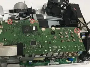 Удалите два винта Phillips #2 (PH2), которые крепят черный вентилятор-обдуватель, расположенный в верхней центральной части платы.