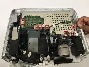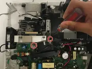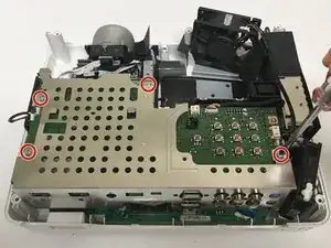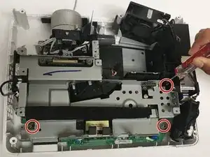 Удалите второй винт Phillips #1 (PH1), который крепит верхнюю часть металлического корпуса, расположенную рядом с задней частью объектива проектора.
