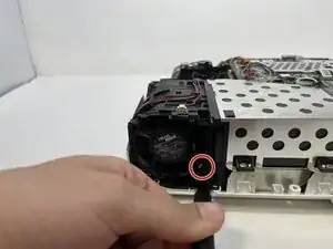 Используйте крестовую отвёртку Phillips #1, чтобы выкрутить три серебряных винта 7 мм, фиксирующих рамку вентилятора.