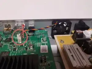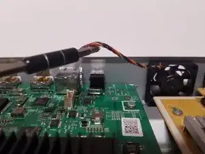 Используйте пальцы, чтобы ухватить белый конец многоцветного провода, соединяющего вентилятор с материнской платой. Удерживая, аккуратно потяните вверх, чтобы отсоединить провода от материнской платы.