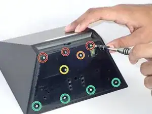Найдите панель, удерживающую кнопки на верхней части устройства. Используя головку винта Torx T5, удалите восемь винтов, чтобы снять панель, удерживающую кнопки.