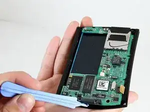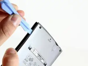 Вставьте край пластикового инструмента для открытия между задней панелью и черным держателем стилуса.