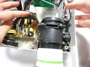 С помощью рук аккуратно отсоедините верхнюю и нижнюю части корпуса проектора.