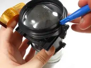 С помощью пластикового инструмента для вскрытия слегка разъедините корпус, удерживающий крупную линзу.