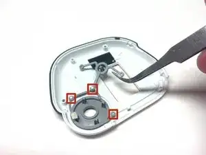 Под крышкой вы найдете три (3) винта 5 мм, которые необходимо отвернуть. Для этого используйте биту PH00 из вашего набора iFixit. Обязательно сохраните эти винты, так как они потребуются при сборке устройства.