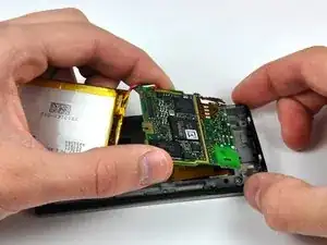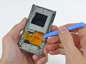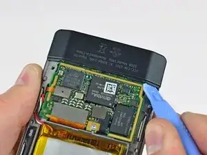Используйте инструмент для вскрытия Zune, чтобы отсоединить разъём ленточного кабеля OLED-дисплея от материнской платы.