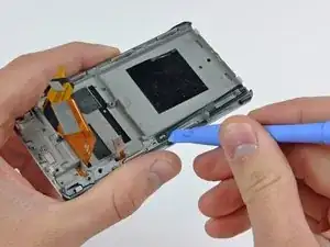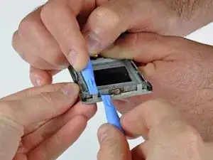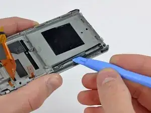 Используйте инструмент для вскрытия Zune, чтобы отклеить ленточные кабели цифрового преобразователя и дисплея от поролоновой ленты, которой они прикреплены к внутреннему каркасу.