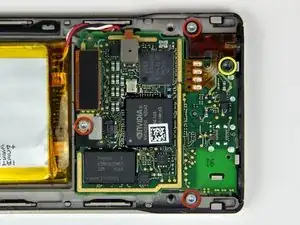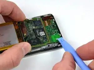 Используйте инструмент для вскрытия Zune, чтобы отвести пластиковую защёлку от материнской платы, одновременно аккуратно потянув плату от нижнего края Zune.