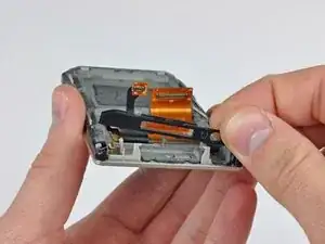 Используйте инструмент для вскрытия Zune, чтобы осторожно отсоединить внутренний каркас от передней панели, одновременно используя другой инструмент для вскрытия Zune, чтобы сдвинуть пластиковую защёлку около разъёма кабеля управления внутрь Zune.