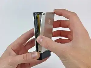 Пять пластиковых защёлок по боковой стороне Zune фиксируются на маленьких алюминиевых выступах, отлитых во внутреннем каркасе. Чтобы разъединить эти защёлки, пластиковую часть необходимо сдвигать внутрь Zune, одновременно отводя внутренний каркас от передней панели.