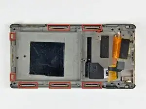 Внутренний каркас крепится к передней панели с помощью нескольких защёлок по его периметру (показаны красным). Защёлки, выходящие из передней панели, выполнены из пластика и по своей природе хрупкие, поэтому работайте аккуратно.
