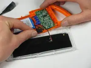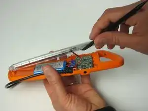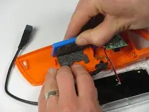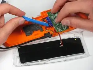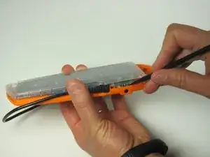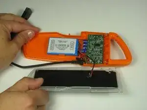 При приподнимании будьте осторожны, чтобы не сломать маленький оранжевый зажим, удерживающий верхнюю панель на корпусе.