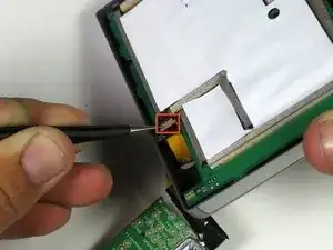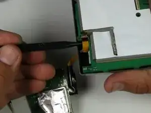 Используйте пинцет или лопатку, чтобы приподнять бежевую защёлку ленточного кабеля (ZIF-разъём) и аккуратно выньте разъём и кабель из-под открытой защёлки.