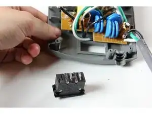 Ослабьте выключатель, надавив на боковые пластиковые защёлки, расположенные внутри корпуса сетевого фильтра.