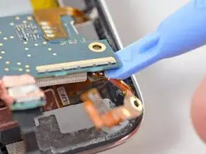 Осторожно приподняв верхний край платы логики, используйте край инструмента для вскрытия iPod, чтобы отподать разъём Wi‑Fi антенны от платы логики.