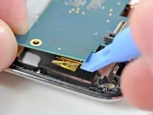 Используйте инструмент для вскрытия iPod, чтобы немного приподнять край логической платы рядом с аккумулятором настолько, чтобы можно было ухватить её другой рукой.