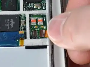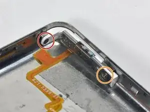 Используйте маленький инструмент для вскрытия iPod, чтобы аккуратно отлепить оранжевую ленточную шлейфовую ленту с прикреплённым чёрным выключателем блокировки от металлической подложки.