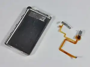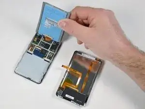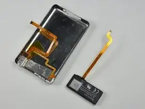 Корпус iPod теперь открыт, но не разделяйте обе половины полностью — две ленточные шлейфы всё ещё соединяют заднюю панель с остальной частью iPod.