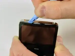 Затем можно вставить инструмент для открывания iPod справа от кнопки Hold. Действуйте очень осторожно при вставке инструмента, так как дисплей очень хрупкий.