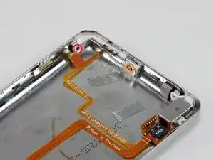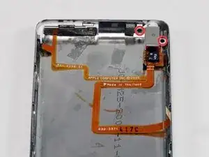Две ленточные шлейфы соединяют заднюю панель с остальной частью iPod. На следующем шаге будьте осторожны, чтобы не повредить эти шлейфы.