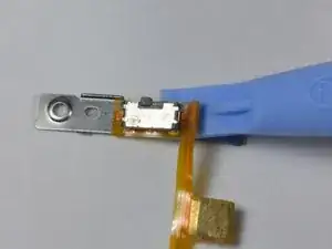 Используйте инструмент для открытия iPod, чтобы аккуратно отслоить оранжевую шлейфовую ленту с прикреплённым чёрным переключателем блокировки от металлической подложки.
