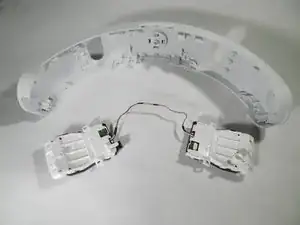 После снятия задней части оголовья обе задние платы трекера светодиодов можно идентифицировать как белые компоненты с маркировкой «L» и «R» на задней части оголовья.