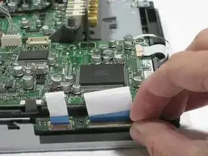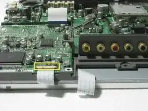 Поверните телевизор так, чтобы левая сторона была обращена к вам, и снимите ленточный кабель аналогичным образом.
