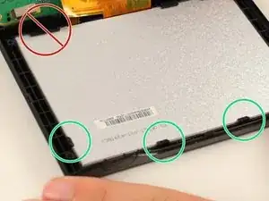 Приложив умеренное усилие, оттяните каждую из треугольных защёлок, удерживающих экран на месте.