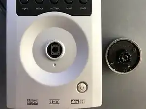 Снимите кнопку громкости с передней части подставки. Снять её может быть немного трудно, так как она слегка приклеена.