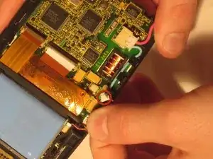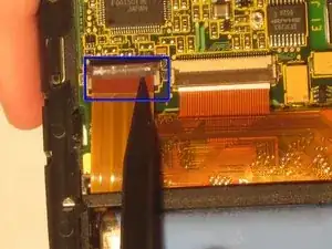 Используйте пинцет, чтобы приподнять ZIF-разъём (коричневую пластиковую защёлку) на задней части платы и отсоединить шлейф, который выглядит как лента.