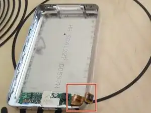 Этот ленточный кабель очень хрупкий. Если вы заменяете аккумулятор, можно пропустить этот шаг и оставить разъём наушников подключённым к материнской плате. Подоприте и зафиксируйте заднюю крышку скотчем к коробке, чтобы она не смещалась. Будьте очень осторожны, чтобы не натянуть и не повредить хрупкий кабель разъёма наушников во время работы.