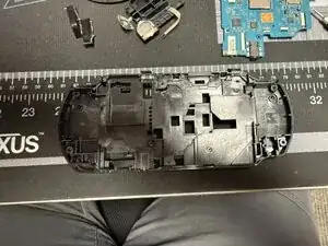 Удалите кабель и кабель питания. Аккуратно поднимите сборку кнопок и разъем для зарядки. Кнопка плеча приклеена, поэтому подденьте ее лопаткой и аккуратно оторвите.