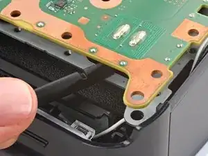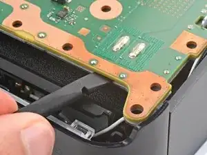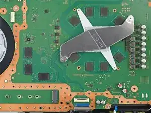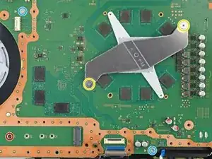 Не пытайтесь полностью снять материнскую плату на этом шаге—угол рядом с кнопкой питания всё ещё зафиксирован металлическими штырями, которые будут отсоединены на следующем шаге.
