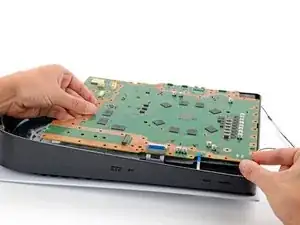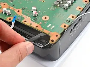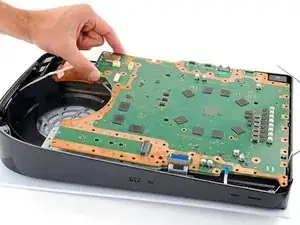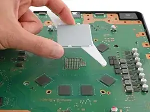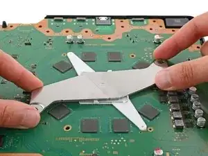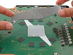 Многие маленькие термопрокладки приклеивают основную плату к металлической экранной пластине снизу. В зависимости от возраста вашей PlayStation и состояния прокладок, может потребоваться значительная сила, чтобы отделить плату.