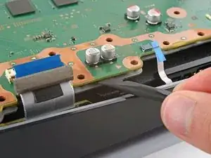 Держа металлическую защёлку в нажатом положении, используйте пинцет, чтобы оттянуть синюю тяговую петлю прямо от разъёма и отсоединить кабель от материнской платы.
