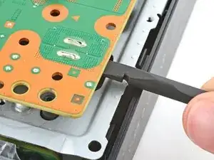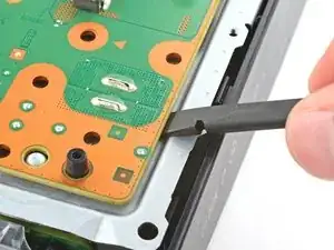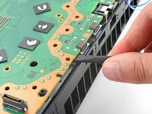 Вставьте плоский конец лопатки между платой и нижней защитной пластиной, у двух параллельных паяных соединений рядом с углом с кнопкой питания.